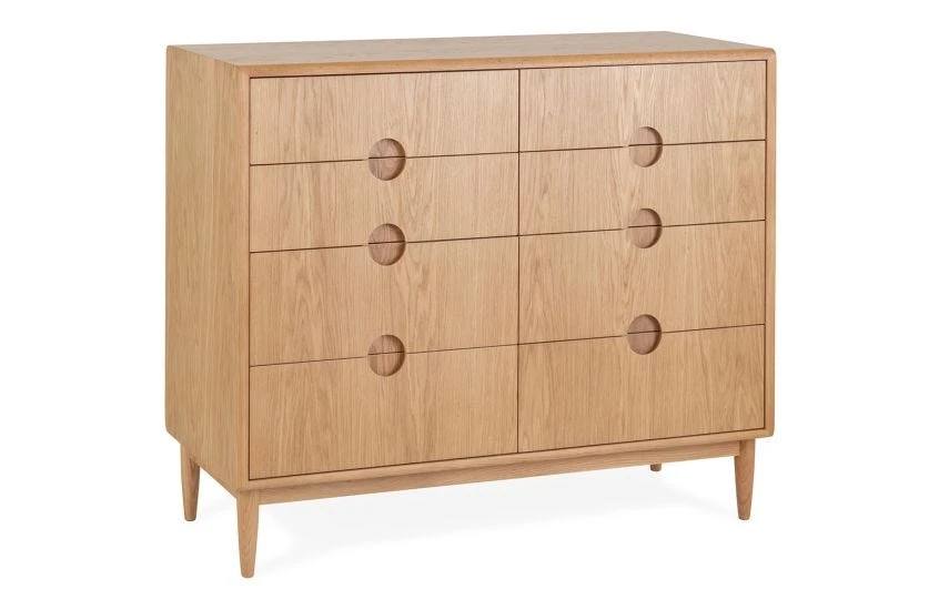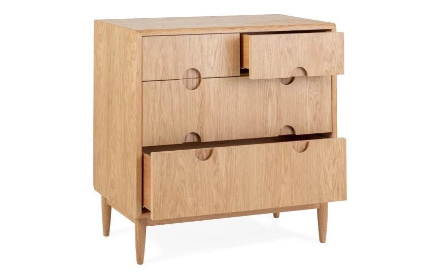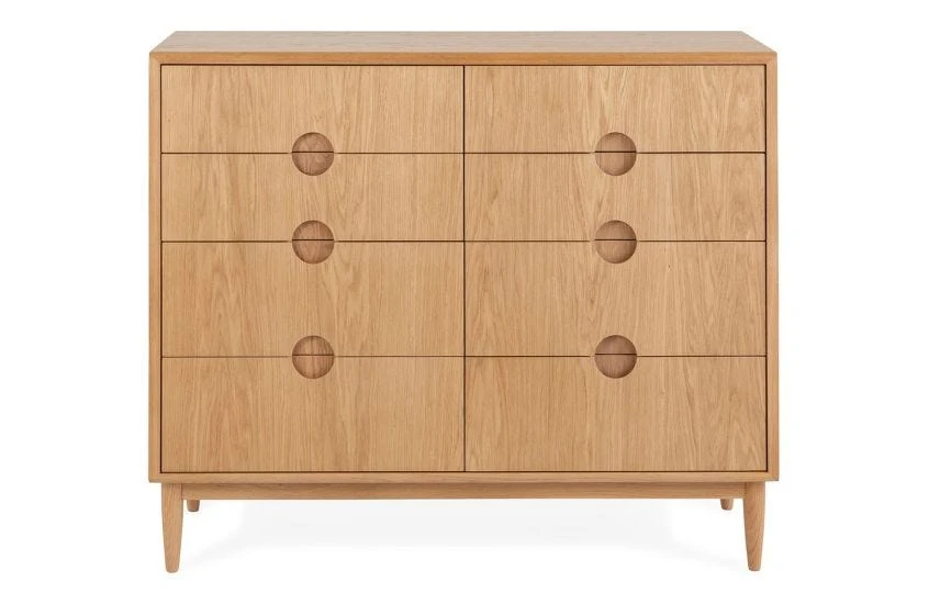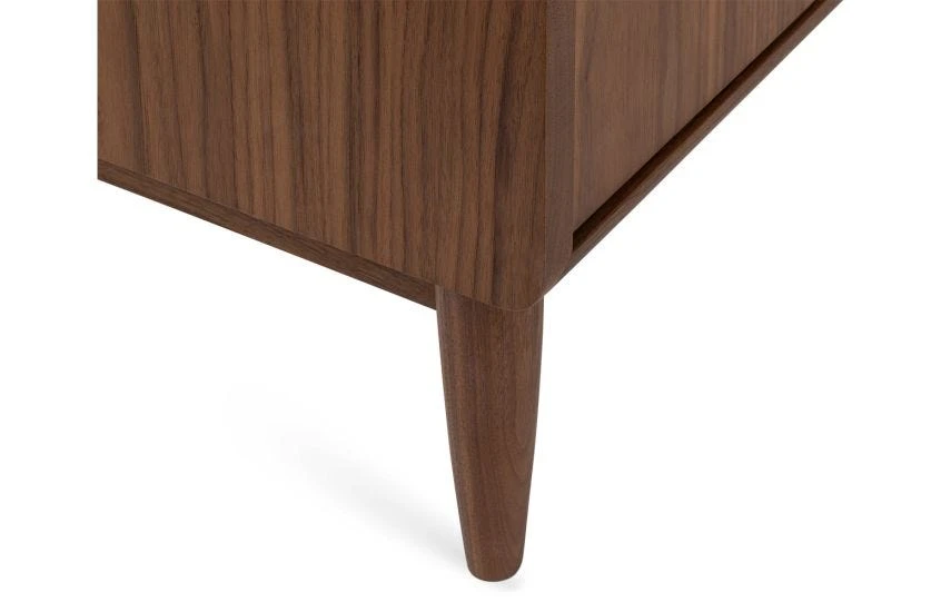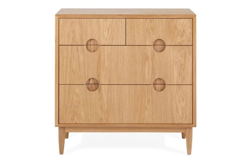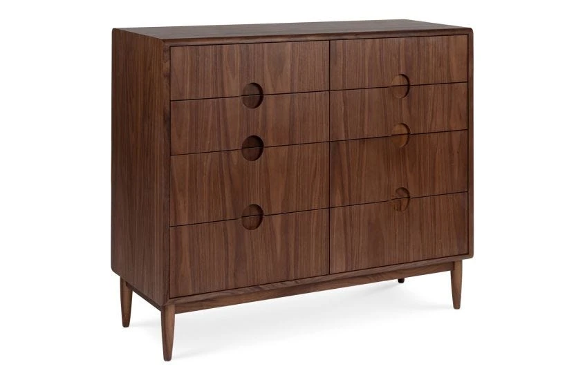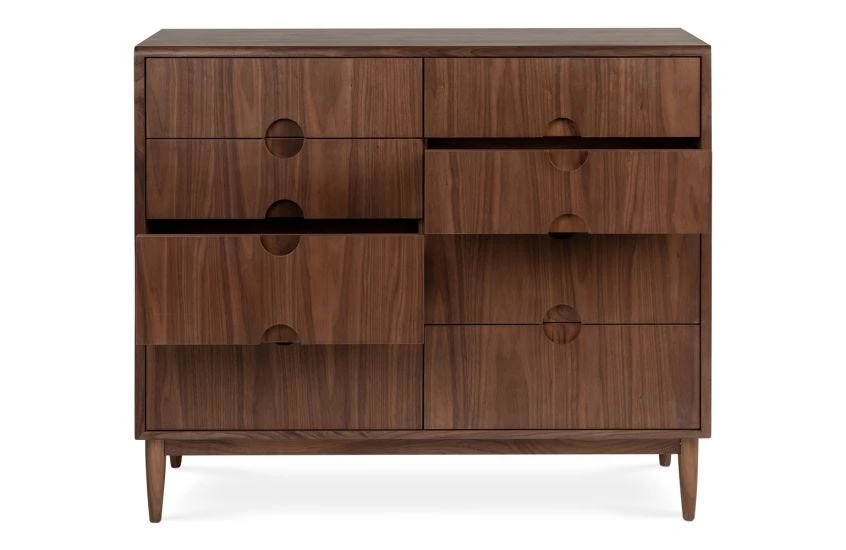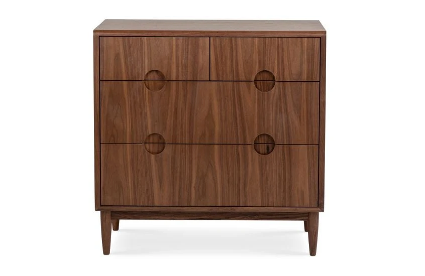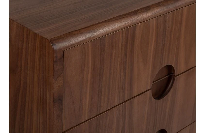- Features ample storage and soft-close drawers with routered handles and soft edges.