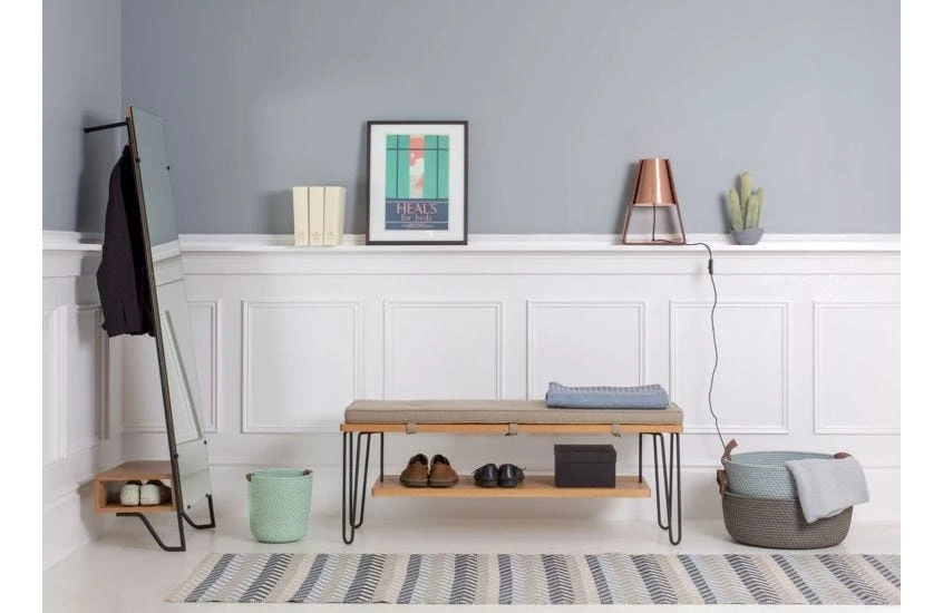 The unique, leaning design is supported by a wall-mountable metal fixture that is concealed on the back of the frame and also offers a useful pole from which to hang pressed shirts, dresses and suits.