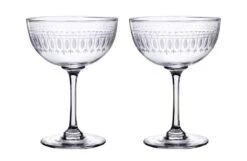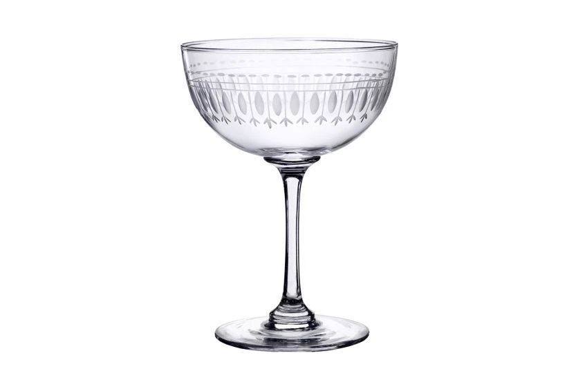 A hand-blown and hand-engraved Champagne saucer with delicate oval Art Deco pattern that circles the glass. Each glass is made from fine lead-free crystal and is dishwasher-safe. Perfect for any style of table or type of occasion.