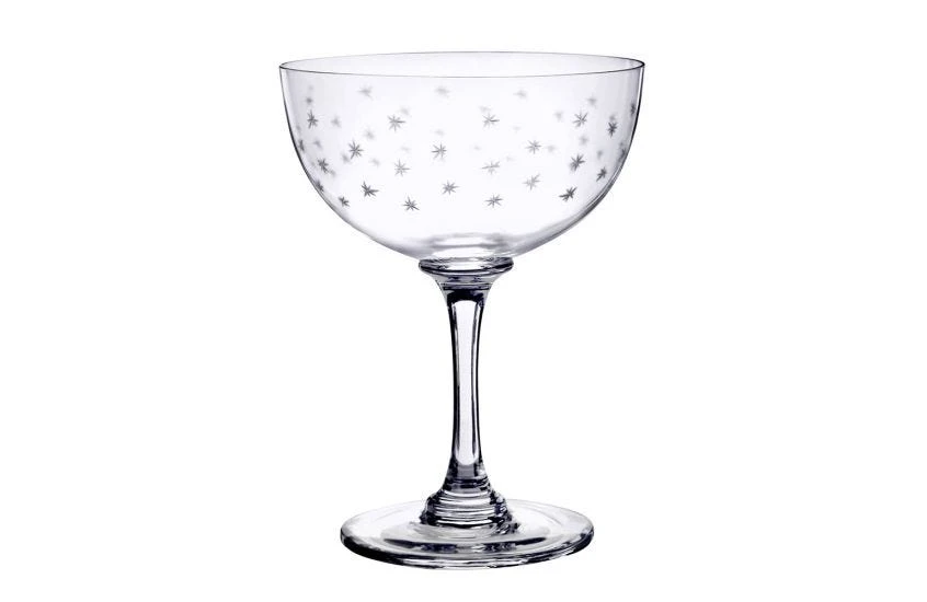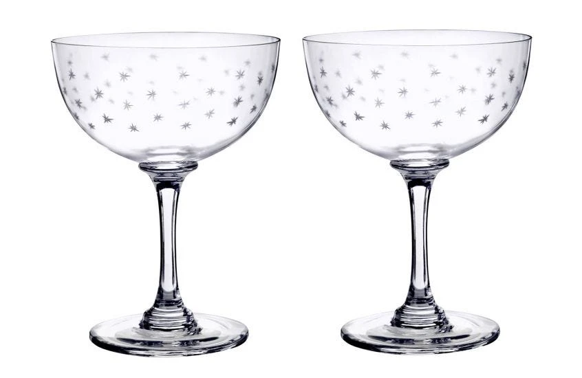 A pair of hand-blown and hand-engraved Champagne saucers with a delicate cut star pattern around the glass. Each glass is made from fine lead-free crystal and is dishwasher-safe. Perfect for any style of table or type of occasion.