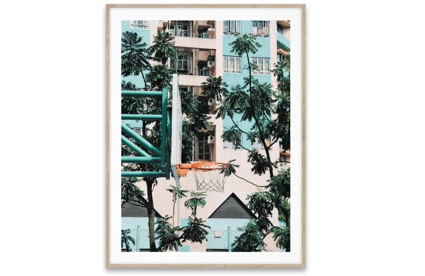 Inspired by a passion for basketball and a deep love for travel, the Cities of Basketball, Hong Kong, is a vibrant piece for any modern living room. Starting as a project to simply whittle away time, this piece transformed into the first piece of a collection that was set to portray basketball in cities around the world. Weaving together a colourful aesthetic and the everyday casualness of basketball in Hong Kong, this is a print that will fit any contemporary interior.