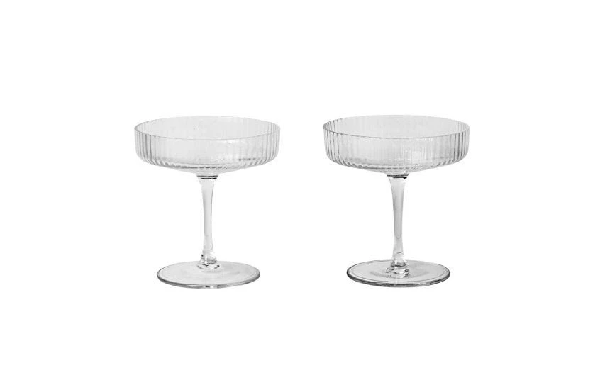 The Ripple Champagne Saucers in Clear are robust yet deliciously delicate in style. The vertically-ridged surface of the saucer contrasts with the slim stem to provide a contemporary aesthetic reminiscent of Art Deco design. These glassese are a unique twist on typical champagne saucers, creating an energetic expression that will stand out in any drinking set. Perfect for all sparkling wines.