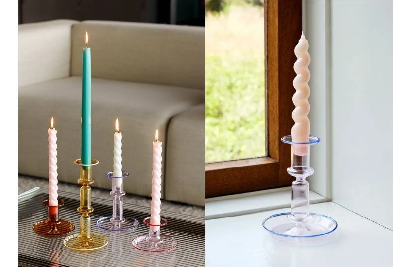 Coloured borosilicate glass creates an elegant and distinct way to display candles in HAY’s Flare Candleholder series. Available in a wide range of designs and colours – with contrast- or tonal-tinted edges, spiralled patterns and tricoloured rainbow design – they are ideal for using with HAY candles on a windowsill or table for creating ambience in the home. Both decorative and functional, they can be used on their own or mixed with different Flare designs or HAY candleholders.