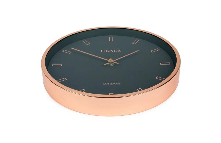 This Heal’s Clock is inspired by an original 50’s Smith’s of London design. The clock features a copper finish case & black face paper with matching copper hands. Simplistic smart design. Each clock comes with AA battery included