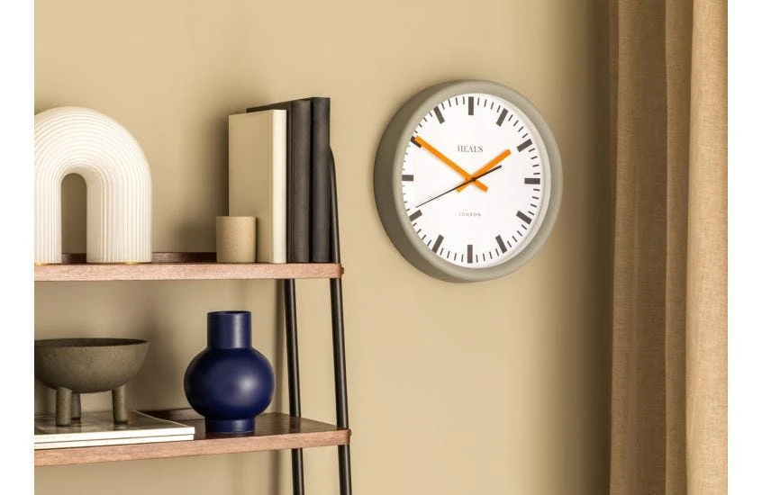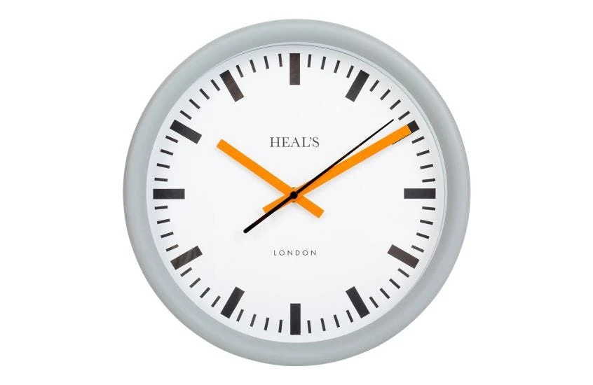 This swiss inspired clock has orange baton hands that feature a continuous sweep movement; whilst the contrasting black seconds hand and chic grey case provide a distinctive look.The clock’s movement is virtually silent making it perfect for reading rooms, bedrooms and music rooms.