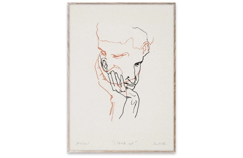 The striking artwork is a blindfolded drawing of a male model in Rodin’s The Thinker pose. This abstract method of drawing involves not looking at the paper whilst the hand runs freely across it. We recommend displaying it as part of a cluster of posters and prints to create your own home art gallery.