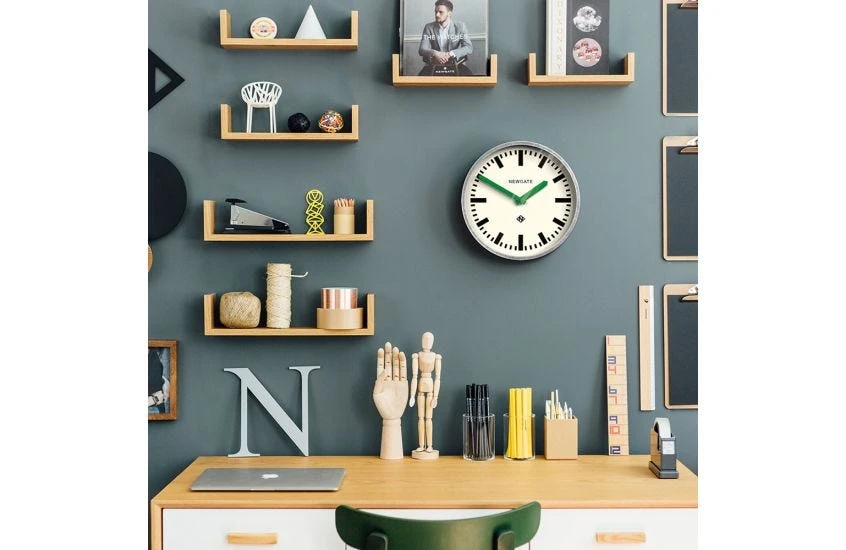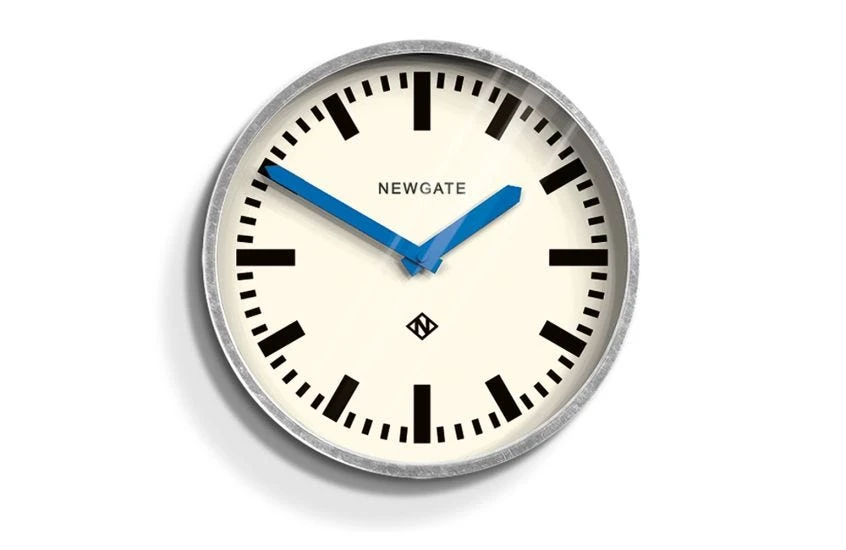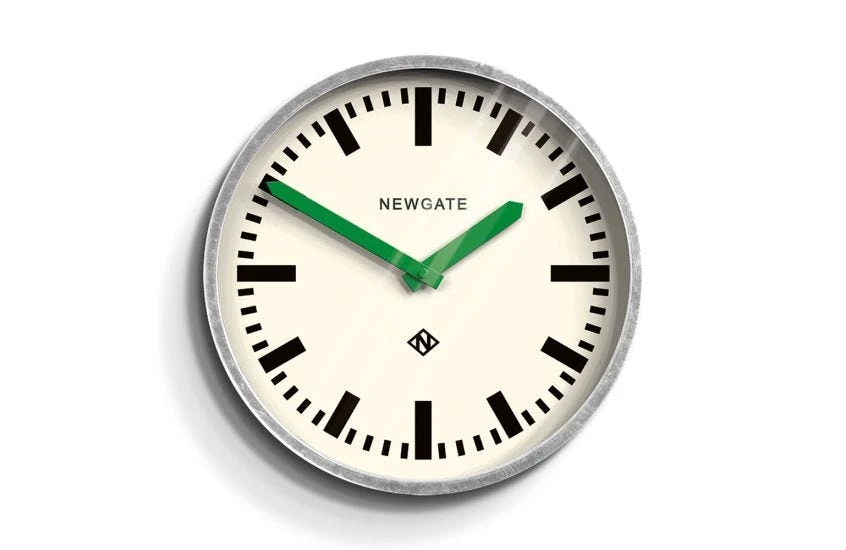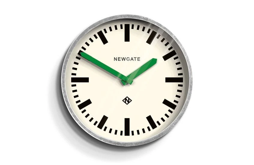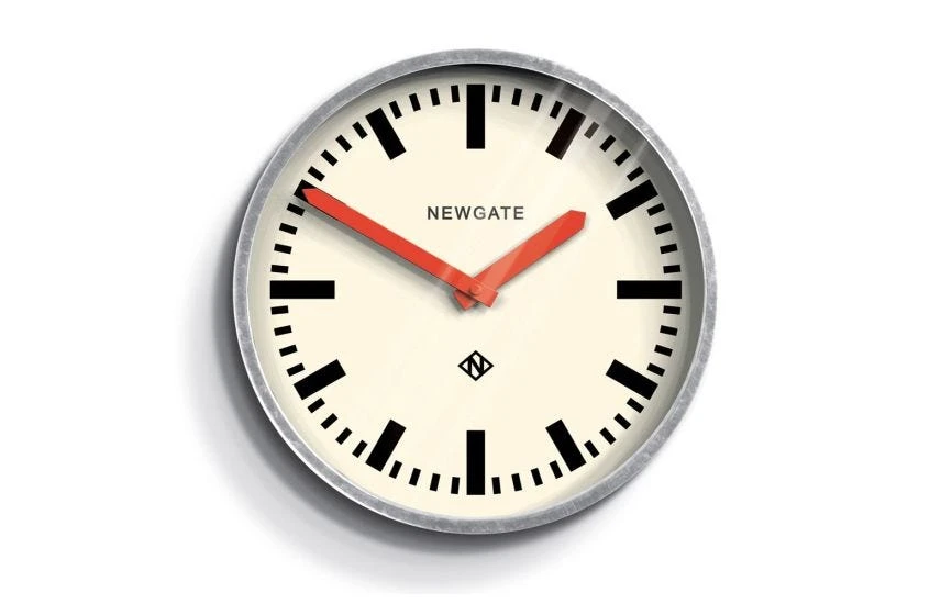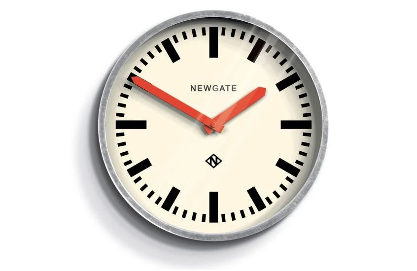 One of Newgate’s most iconic clock designs, the Luggage is inspired by the mid-Century railway station clocks that Newgate’s founders collected on their travels across Europe. A small black station wall clock with a bold marker dial, contrasting hands and deep straight-cut metal case with a gloss black finish.
