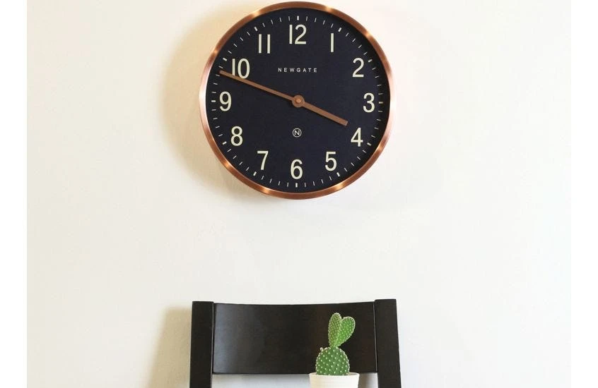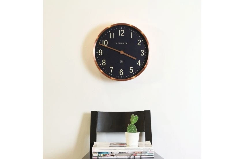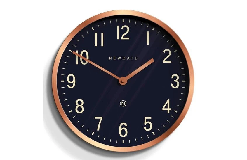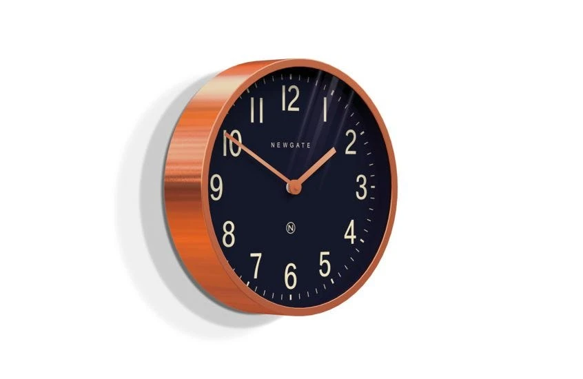 This Master Edwards wall clock features a solid circular metal case which is straight cut for a clean and graphic line. The deep brass case holds a bold modernist dial and a flat glass lens.