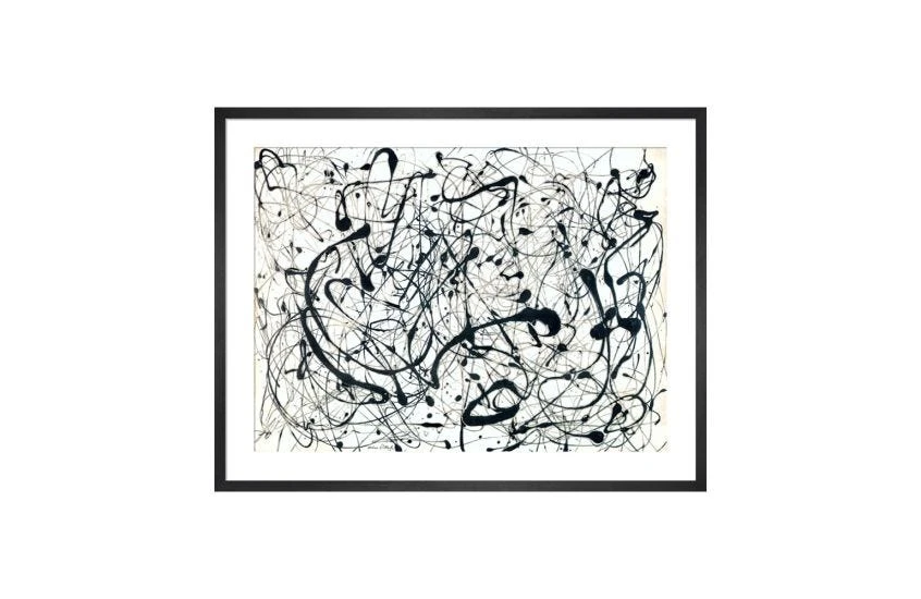Jackson Pollock’s 1948 artwork Number 14: Gray is painted using his world-famous ‘drip technique’. This technique involves dripping black enamel paint onto the surface of wet gesso to create a bleed between the two colours. It’s printed by King & McGaw on high-quality matte paper and presented in a stained-black solid ash frame that’s ready to hang.
