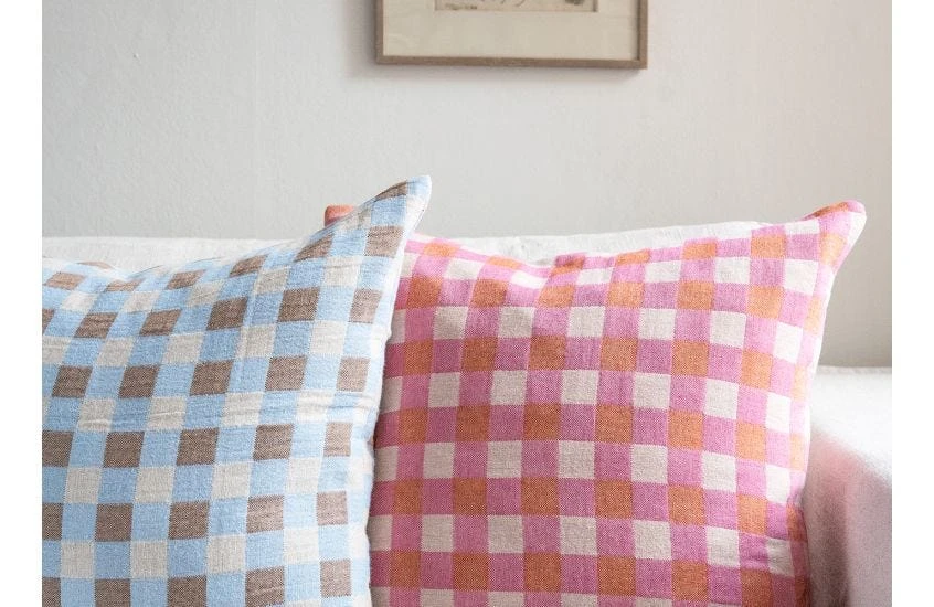 The cushion features a striking blue check crafted from a soft merino wool blend.