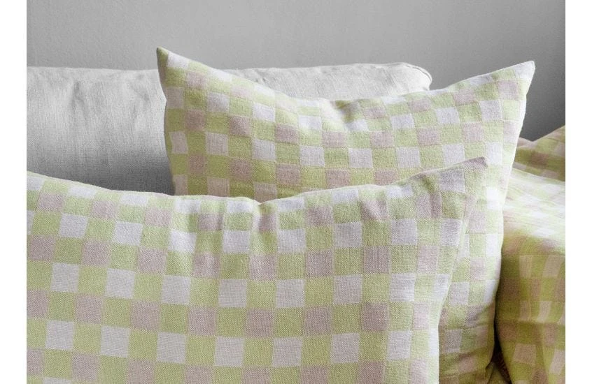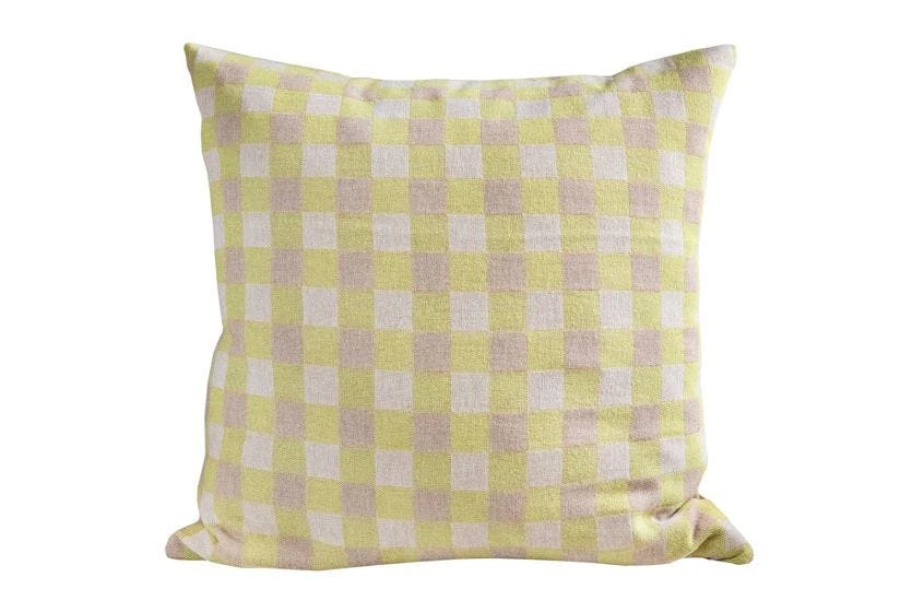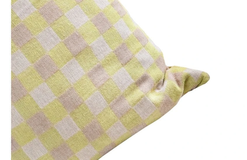 The cushion features a striking green check crafted from a soft merino wool blend.