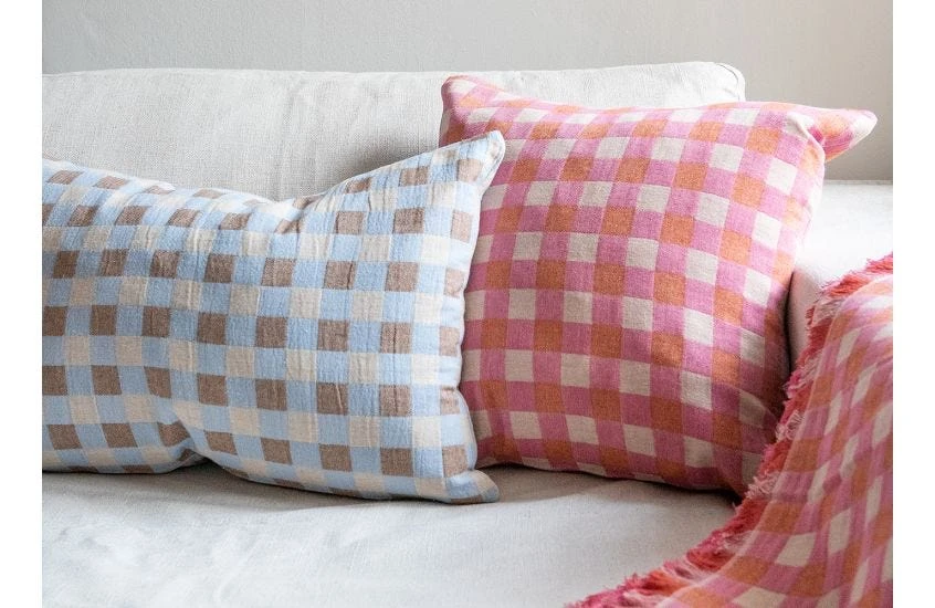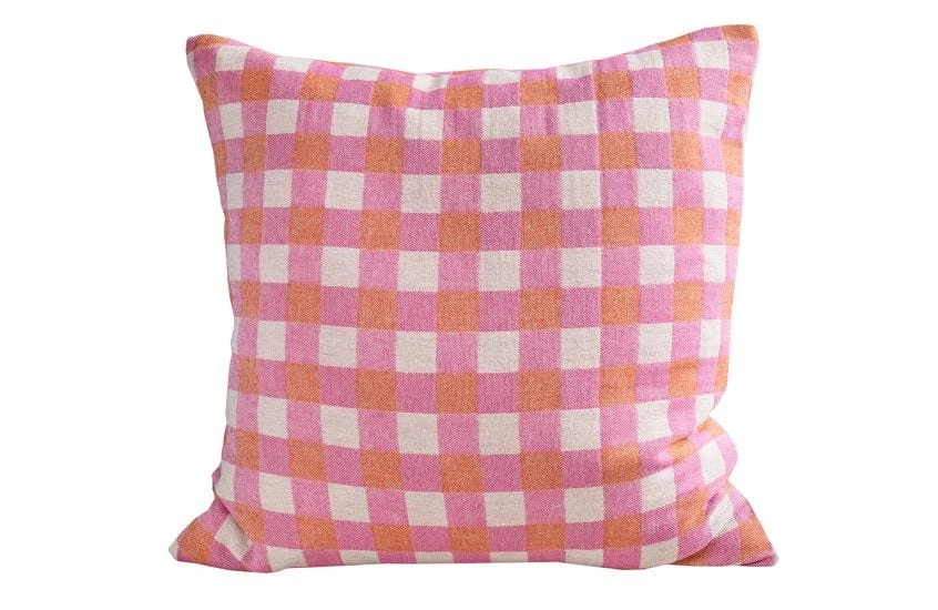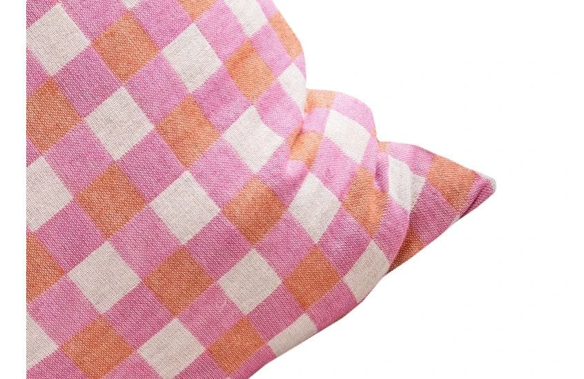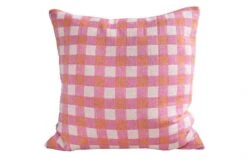 The cushion features a striking pink check crafted from a soft merino wool blend.