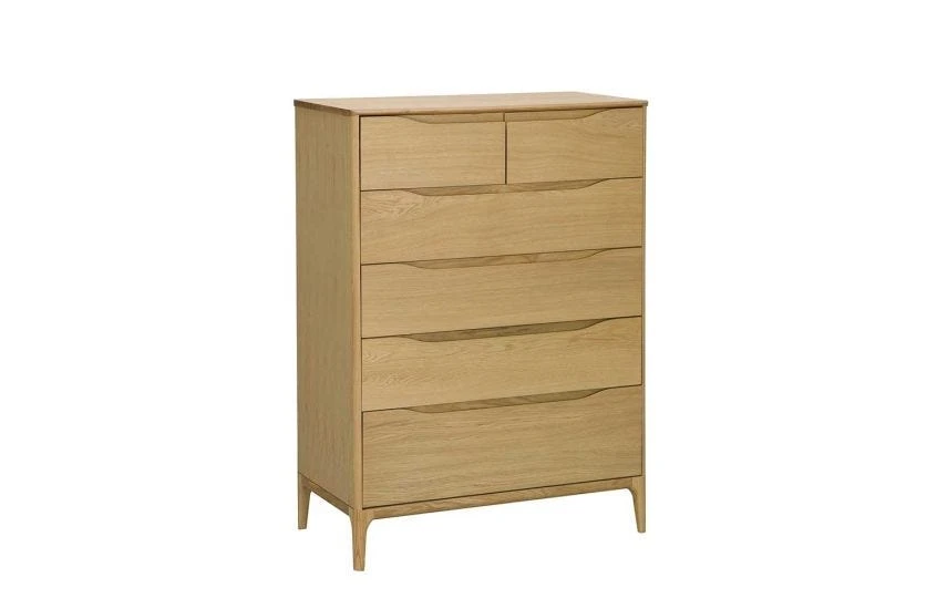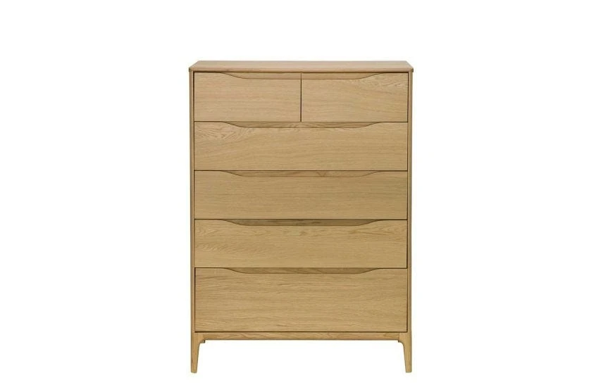 Created by the ercol Design Studio, the oak Rimini 6-Drawer Chest boasts four full-width drawers and two smaller ones to provide practical bedroom storage.