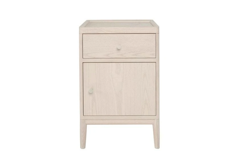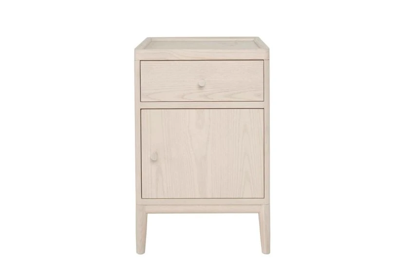 This bedside cabinet is finished in pale ash with a whitewashed stain and clear matt lacquer displaying the pattern of the wood grain through the finish and creating a calm and light feel in any bedroom.