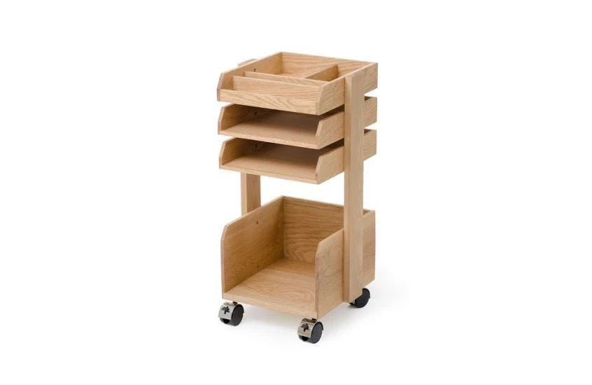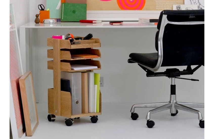 The organiser boasts three trays, the top of which is divided into four compartments for storing stationery.