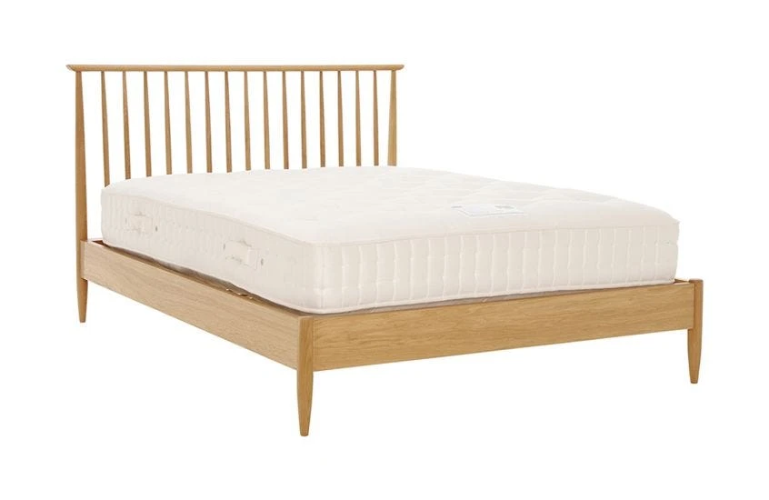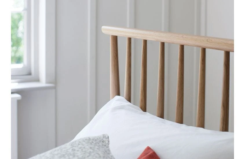 The Teramo bedroom range from Ercol is a collection of timeless pieces that combine Shaker-style craftmanship with elegant woodwork. Crafted from solid and veneered pale oak, this understated bed boasts a clean-lined design with softly tapered legs and a headboard of turned spindles. Beautiful in its simplicity, the bed provides a restful night’s sleep thanks to its pre-sprung wooden slats. A clear matt lacquer finish showcases the natural beauty of the oak, creating a piece that sits front and centre in any bedroom.
