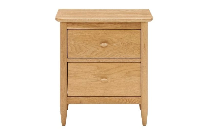 The Teramo bedroom range from Ercol is a series of timeless pieces that combine Shaker-style craftsmanship with elegant woodwork. Crafted from solid and veneered pale oak, this bedside cabinet features two spacious drawers for storage, each finished with double-chamfered oval handles. Tapered turned legs and gently curved edges complete the design, creating a defined silhouette that sits well in both modern and traditional schemes. The cabinet is finished in a clear matt lacquer, making a real feature of the natural oak.