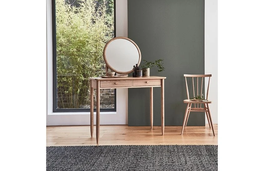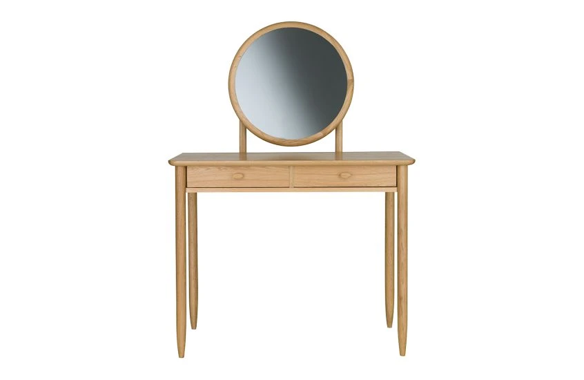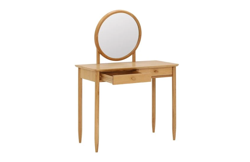 Features a circular mirror and two vanity drawers with built-in organisers.