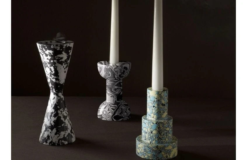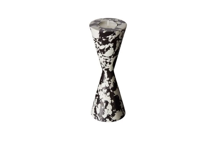 Swirl Cone is a candleholder with a distinct silhouette, colouration and personality. Substantial in weight, smooth in texture and bold in pattern, Swirl will inject a fresh pop sensibility into any setting. Made using recycled powdered marble residue, this scultpural candle holder is both decorative and functional. The unique process with which Swirl is made involves recycling the powdered residue from the marble industry, mixing it with pigment and resin to create blocks of material that can then be sawn, sliced and turned on a lathe. Due to the nature of the pigmentation, each piece features a unique pattern due to the pouring process.