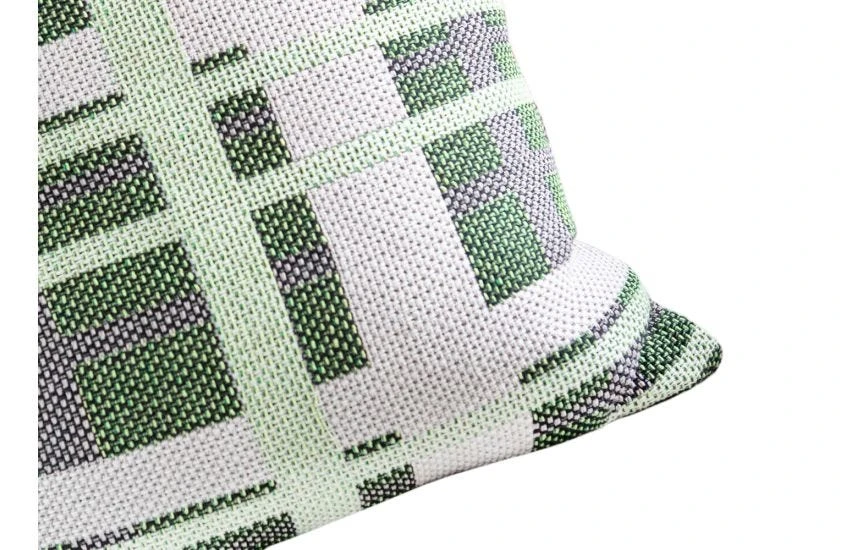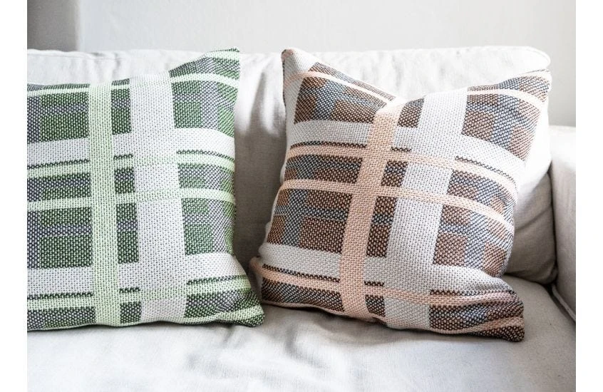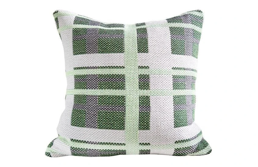 The cushion features a striking green check crafted from 100% recycled cotton.